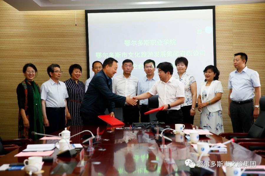 签约仪式上,巴图查干介绍了鄂尔多斯职业学院发展历程以及在专业建设、人才培养、教学改革、产教融合、校企合作等方面取得的成绩,并就与市文旅集团合作进行了深入交流。孙志刚围绕集团酒店管理、会展传媒、旅行社、旅游商贸、航空旅游等业务板块进行了全面介绍,重点就依托学院完善的配套设施、雄厚的师资力量和集团国企平台优势、资源整合引领优势及市场合作优势,在承接学院餐饮、住宿、物业等后勤保障服务,合作拓展职业技能培训业务,共同推广研学游学项目,建设校企实训基地,开发文创产品等具体合作事项进行洽谈、沟通。