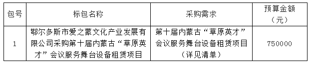鄂尔多斯市爱之蒙文化产业发展有限公司采购第十届内蒙古“草原英才”会议服务舞台设备租赁项目预竞争性谈判,欢迎符合资格条件的响应人前来报名参加。