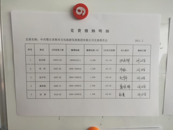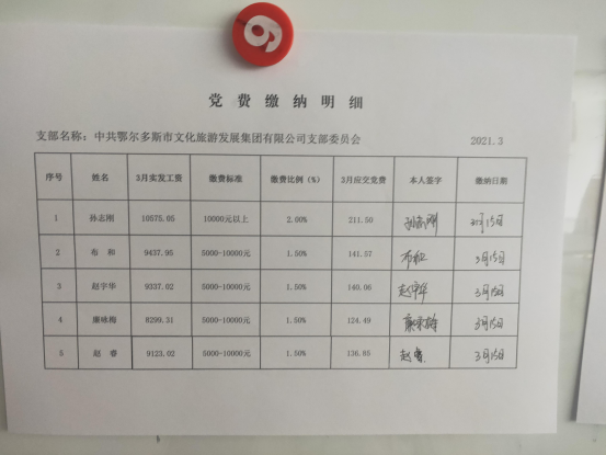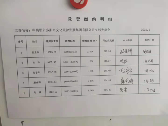 鄂尔多斯市文化旅游发展集团2021年第一季度、第二季度党费收缴情况