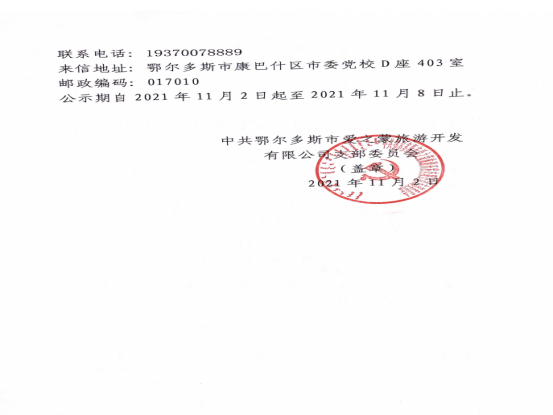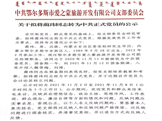 中共鄂尔多斯市爱之蒙旅游开发有限公司关于拟将蔺玮转为正式党员的公示