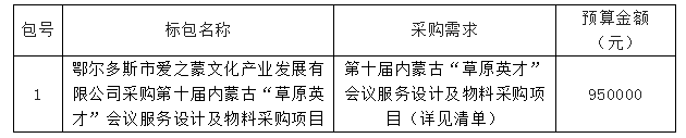 鄂尔多斯市爱之蒙文化产业发展有限公司采购第十届内蒙古“草原英才”会议服务设计及物料采购项目预竞争性磋商,欢迎符合资格条件的响应人前来报名参加。
