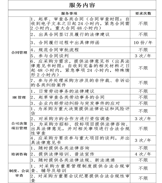 1、采购“法律服务”工作具体见《服务内容表》(附表1);